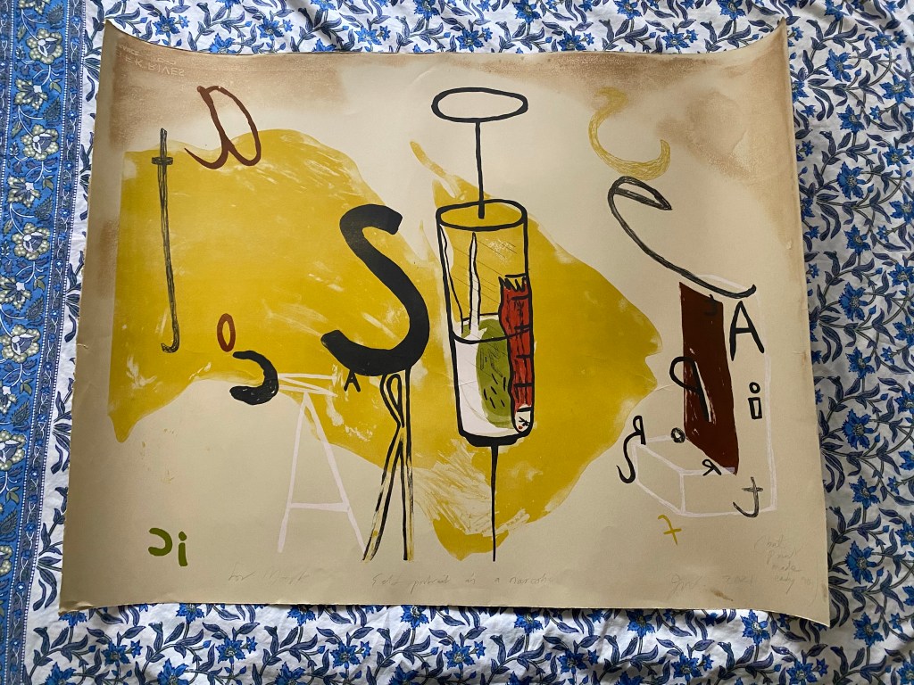 It’s a proof of a print for a lithograph she worked on, its “rawness” something she thought I might like. On the one side, Self Portrait as a Narcotic. On the other side, Death of a Horse. Like two sides of a strange coin, or the left and right atriums of a heart maybe.