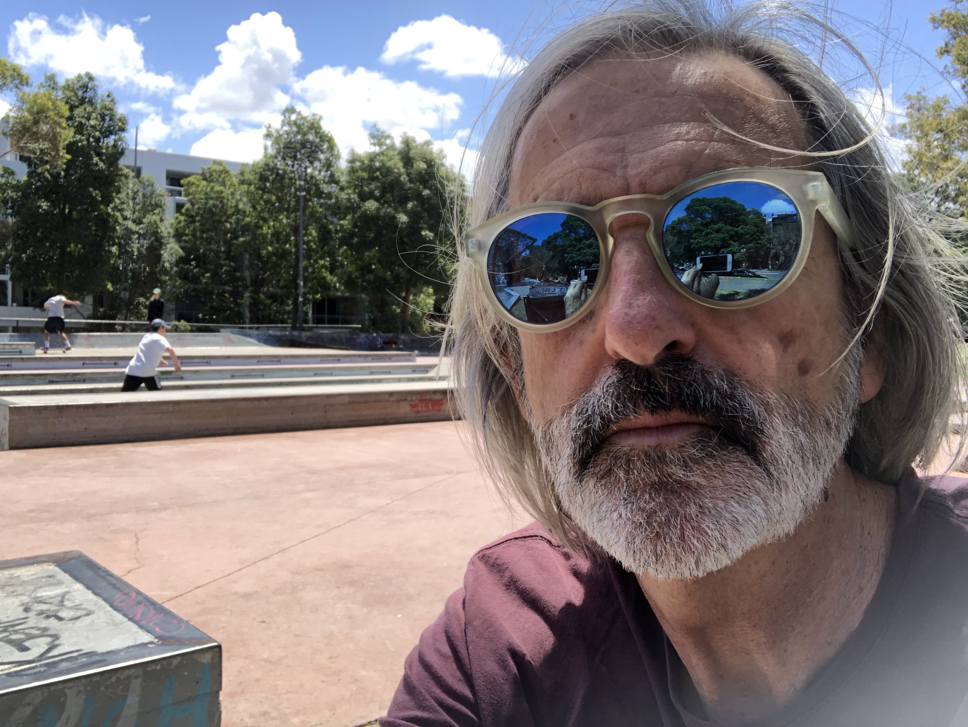 During this time, I have got to know a host of Sydney skateboarding locations. White Park in Annandale. The basketball courts in Summer Hill. A forlorn-looking half-pipe in Jubilee Park, Glebe, that is ridden late in the day by a group of grungy older teenagers drinking beer and playing music. One night I see a ratty white t-shirt pinned to the storm-wire. Someone has written ‘JAKE PHELPS FOREVER’ on it in black texta. I assume one of them has died. Blowing in the wind, glowing in the moonlight, it communicates how emphatically lonely, yet big-hearted this world can be. Later on, I find out it’s for the street-punk founder of Thrasher, the bible of skateboard magazines. Found dead of unknown causes in March 2019, Phelps was 56. Drugs, an inability to grow up, mental illness… who knows what his last ride was about. But here in the dark in Glebe, they grieve for him and his contribution to their world.