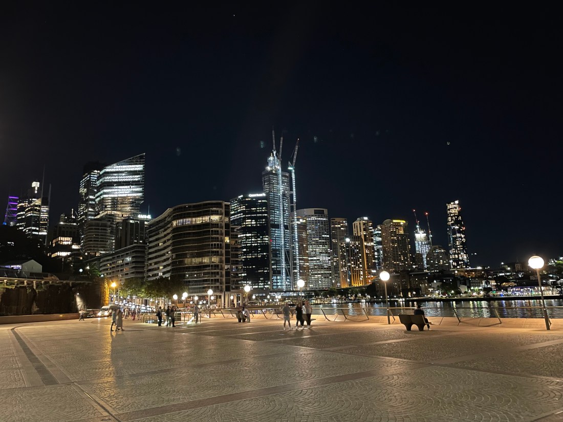 As we walk the foreshore of Sydney Harbour, the Bridge is ignited by a river of cars, its shape reflected in the water. Something like a hundred roller-skaters pass by us as we stroll along. Mutual ropes of people in the night: those metabolised by The Necks; and this other group on the move, their wheels glowing in spinning circles of pink and blue. Laughter, voices. The lit city ahead for all of us.